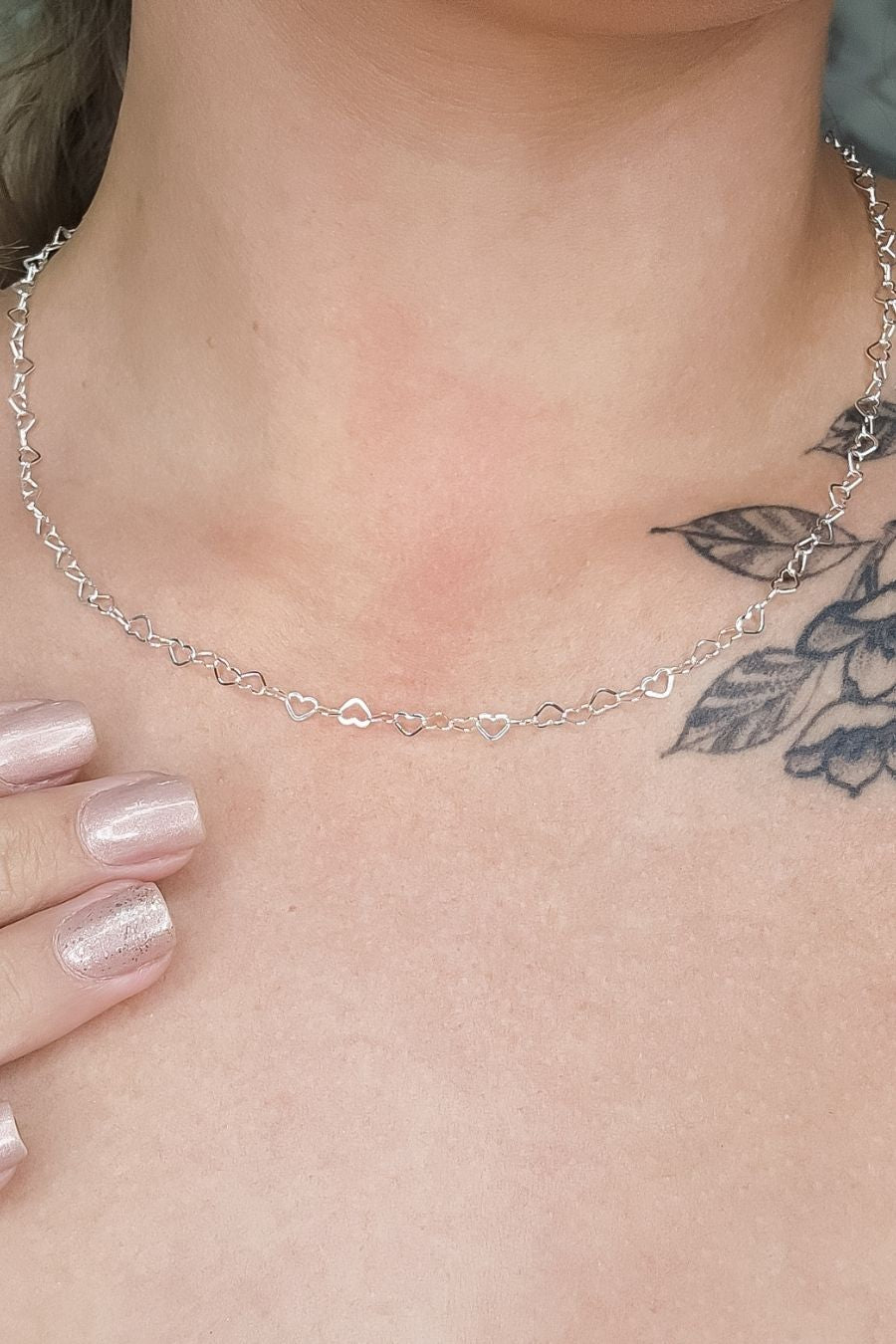 Design: Corrente com detalhes de corações interligados.